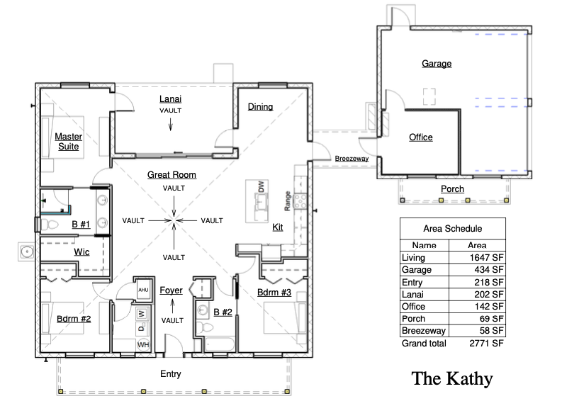 The Kathy is a versatile three-bedroom, three-bathroom single-story home encompassing roughly 1,800 square feet. It’s design emphasizes flexibility and convenience, making it an excellent choice for families who need a bit of extra space or homeowners who love to host guests. With a well-balanced layout, The Kathy provides both open communal areas and private retreats. Step through the foyer and you’re welcomed by a spacious great room that flows into an open kitchen and dining area. The kitchen is a highlight: ample counter space, a large center island, and a breakfast nook by the window create a perfect setting for everything from casual weekday mornings to holiday feasts. The Kathy feels bright and airy throughout. Outside, a covered lanai invites you to enjoy outdoor living, and the front entry porch provides a warm welcome. The Kathy comes standard with a two-car garage, with an option to expand to a three-car if needed. As always, premium construction and energy-efficient features are built into every inch. The Kathy’s flexible design means it can adapt to your lifestyle — whether you need a home office, a guest suite, or just room to grow.